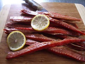 It's got a hint of sweetness to it, but don't let that fool you since it is chock full of great protein and Omega 3 fats. This is one filling treat and it only takes a little to do the trick. After I have de-skinned the strips, I put it in a glass tupperware bowl in the fridge and it should easily stay for about a week's worth of nibbling, depending on how much you get of course.
